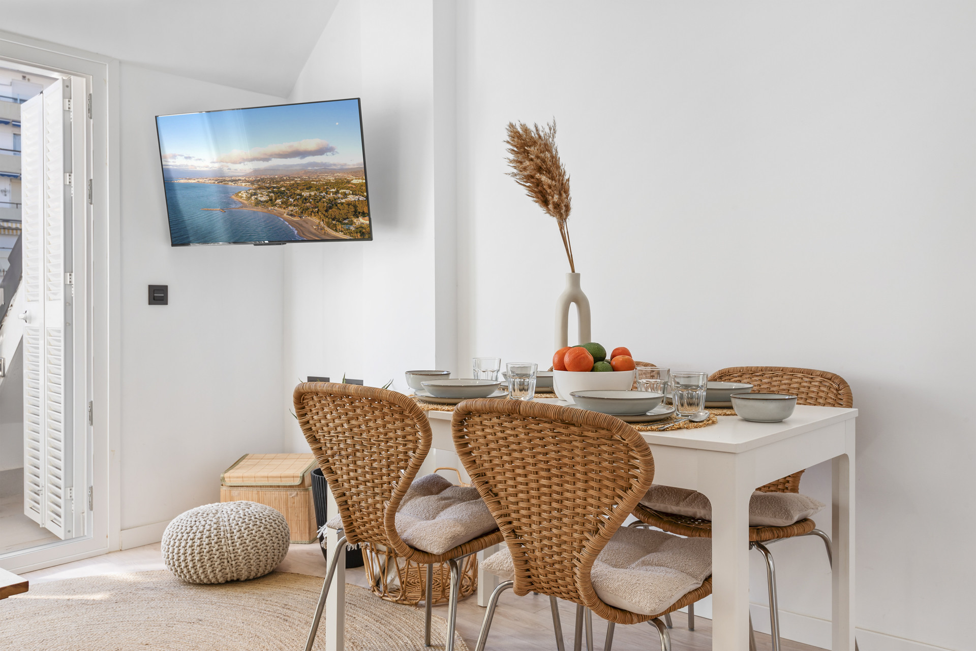 Binnen beschikt het appartement over hoogwaardige afwerkingen en een hedendaags design. De keuken is volledig uitgerust met moderne apparatuur om een naadloos verblijf te garanderen. Met hoogsnelle wifi en klimaatbeheersing inbegrepen, is dit appartement de ideale keuze voor gasten die op zoek zijn naar premium kwaliteit en comfort op loopafstand van alles wat Fuengirola te bieden heeft